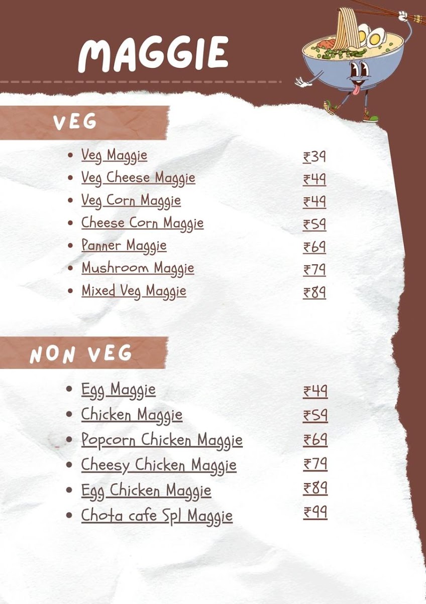 Chota Cafe is particularly famous for its mouth-watering Maggie noodles, available in both vegetarian and non-vegetarian varieties. For the veggie lovers, don't miss the Paneer Maggie priced at just ₹69.00 or the more exotic Mushroom Maggie for ₹79.00. If you fancy something cheesy, their Cheese Corn Maggie at ₹49.00 delivers a delightful flavor explosion that you simply cannot resist. Meanwhile, non-vegetarians can indulge in their Chota Cafe Spl Maggie, alongside options like Cheesy Chicken Maggie and Popcorn Chicken Maggie, ensuring there's something delicious for everyone.